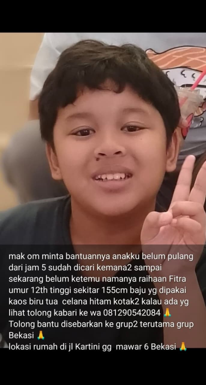 Raihan Fitra alamat rumahnya di jalan Kartini Gang Mawar No. 06 Brkasi, Jawa Barat, sudah 2 hari tidak pulang kerumah, semejak pergi dari kamis, kini sudah sabtu 15 Nopember 2025, tak kujung pulang, Bekasi, Jawa Barat, sabtu (15/11).