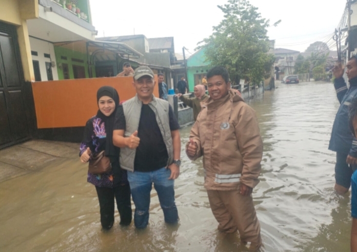 Anggota DPRD Kab Tangerang melihat situasi ke Desa Kadujaya dalam keadaan banjir.
